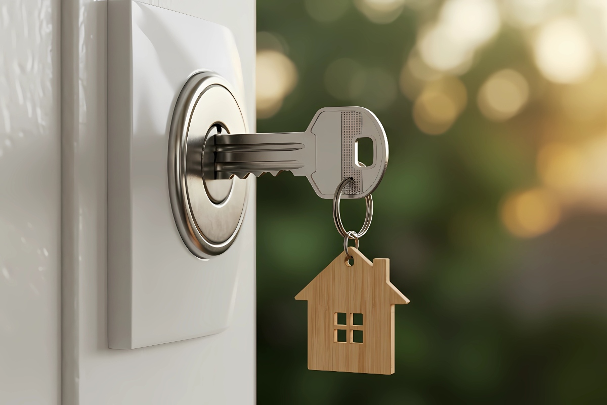 Porta di casa con chiavi inserite e portachiavi a forma di piccola casa. - www.economiafinanzaonline.it